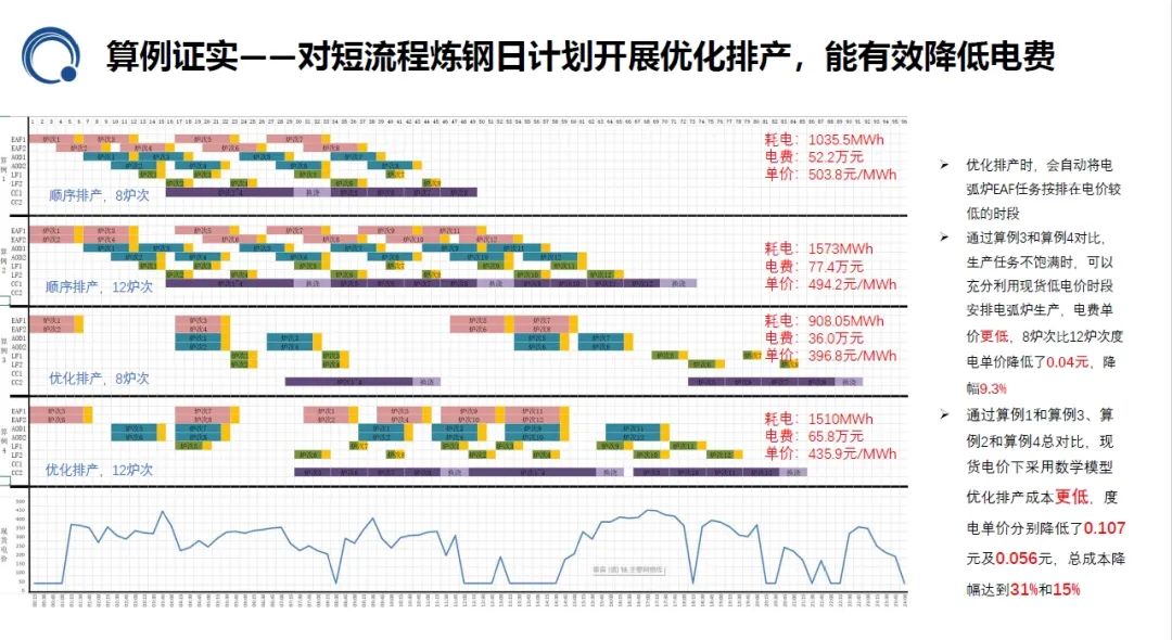 通過(guò)模擬測(cè)算,利用安捷物聯(lián)電力交易管控平臺(tái),在現(xiàn)貨電價(jià)下采用數(shù)學(xué)模型,通過(guò)優(yōu)化排產(chǎn),成本更低,8次爐和12次爐的度電單價(jià),分別降低了0.107元及0.056元,總成本降幅達(dá)到31%和15%。
